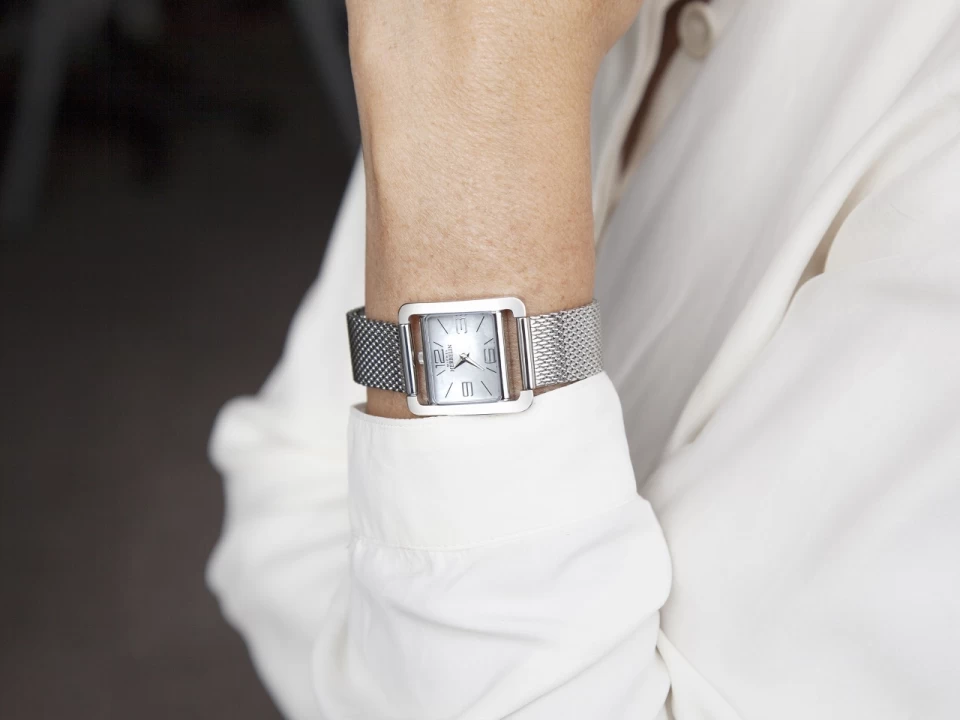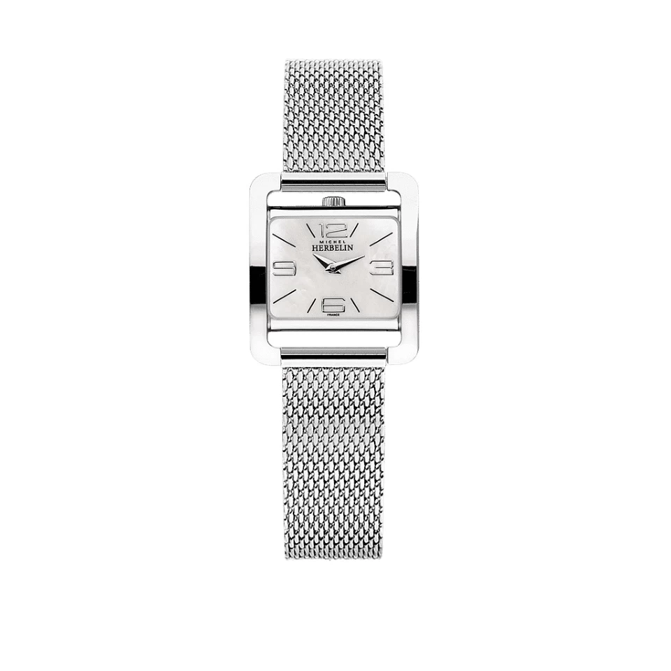 Décalée par sa couronne à midi, cette montre Michel Herbelin assume sa différence. Un boîtier rectangulaire en acier 316L ajouré la démarque avec style. Habillée d’un bracelet acier milanais, la collection Vème Avenue épouse avec harmonie les poignets féminins.
