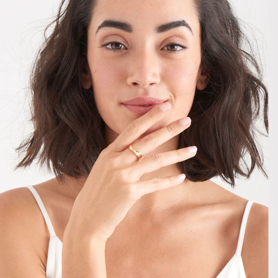 Bague ouverte twistée, en argent plaqué 14k jaune, et d’une largeur de 5 mm.