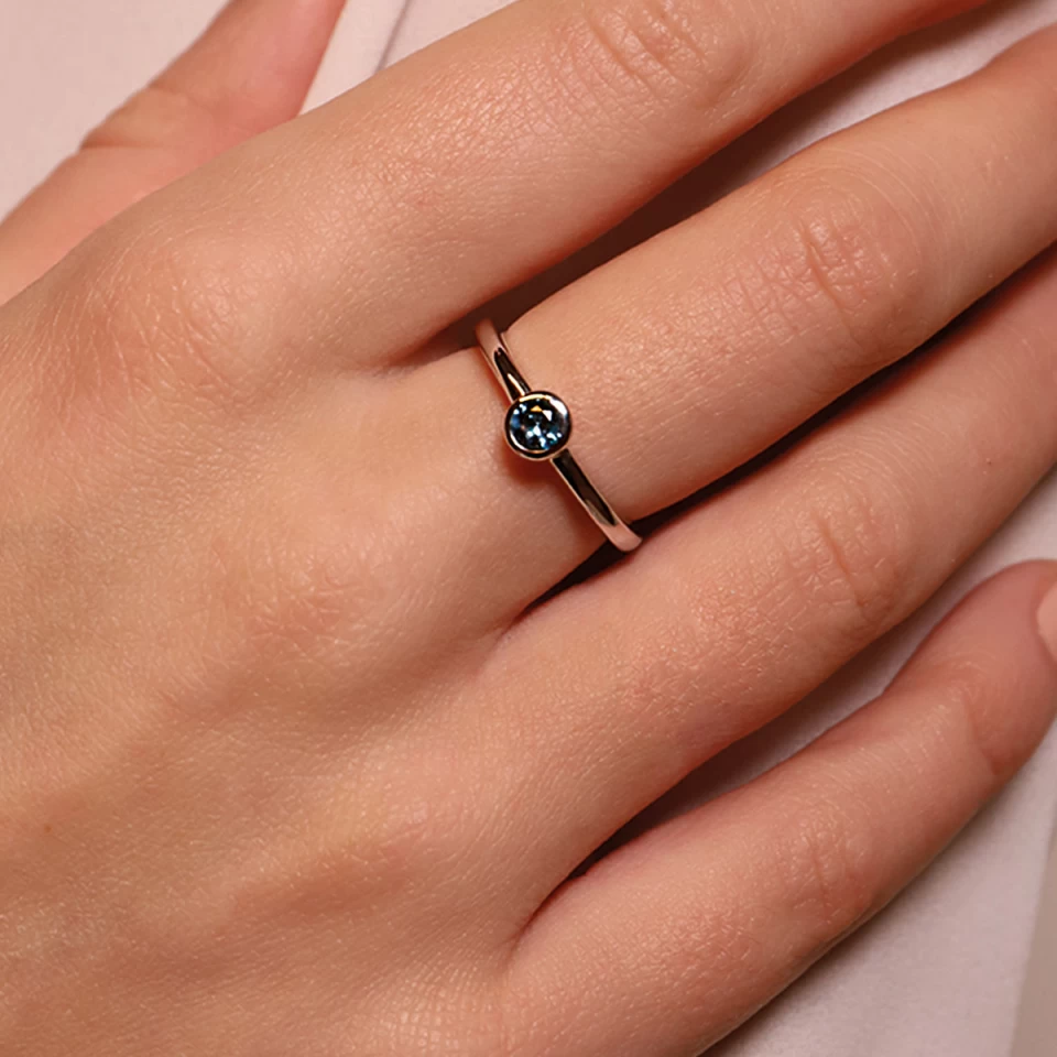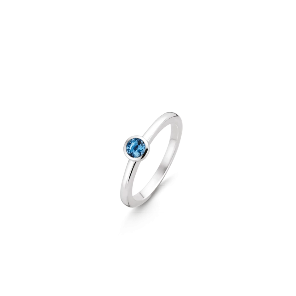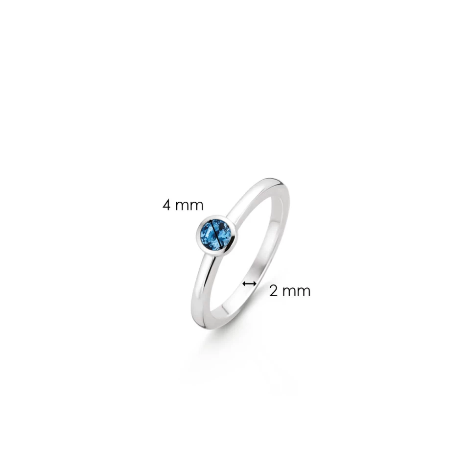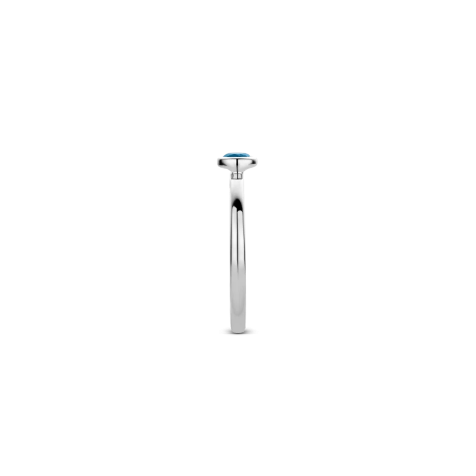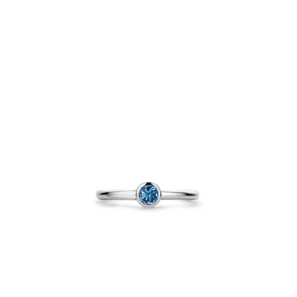 De la collection italienne Ti Sento, bague argent fini rhodium sertie d’un cristal bleu de 4 mm dans un collet.