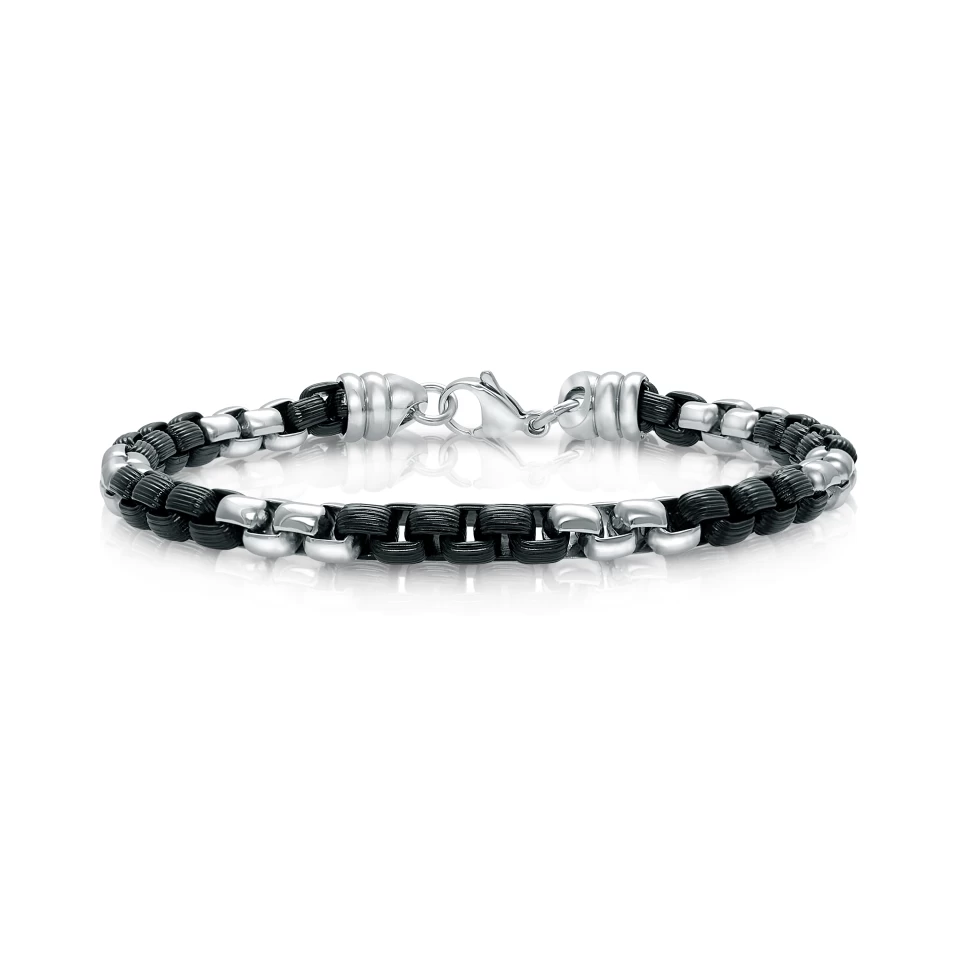 Bracelet à mailles carrées arrondies, en acier inoxydable 2 tons ionisé noir, et d’une longueur de 8.5 pouces.