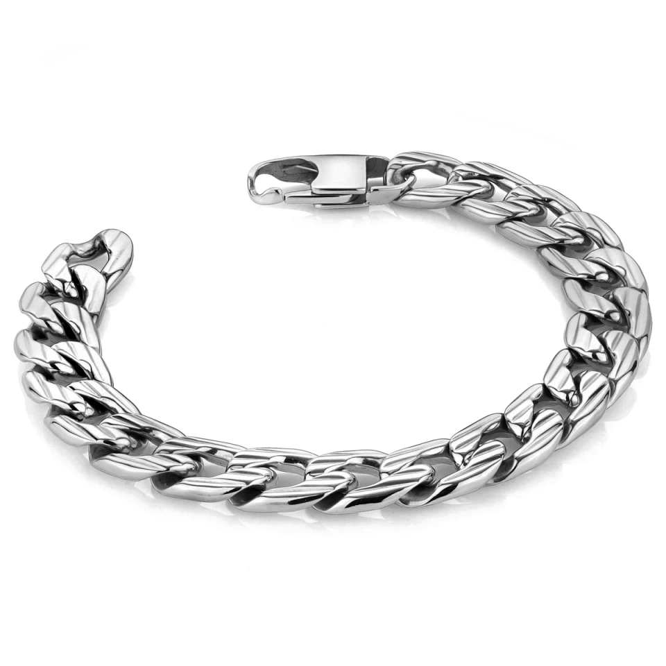 Bracelet mailles gourmettes gravées en acier inoxydable poli, d’une largeur de 12 mm et d’une longueur de 8.25 pouces.