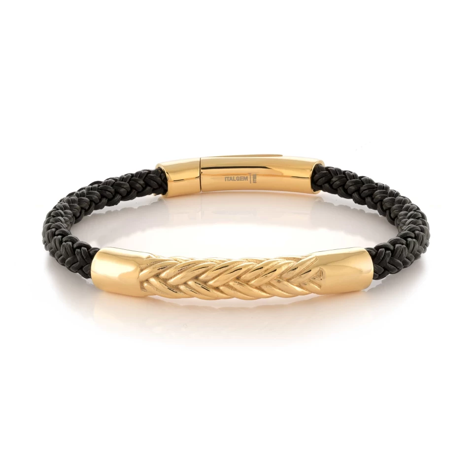 Bracelet en cuir noir tressé avec motif chevron en acier inoxydable plaqué en or jaune.