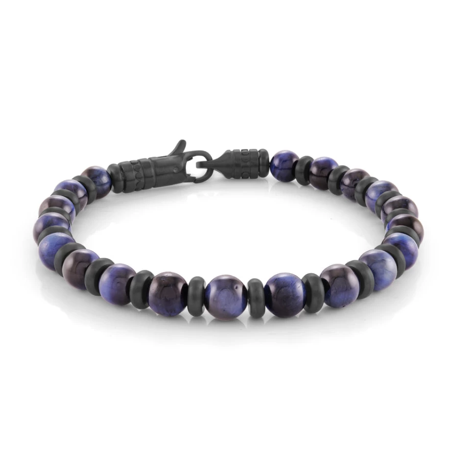 BRACELET OEIL DE TIGRE BLEU ET ÉLÉMENT SS IONISÉ NOIR MAT