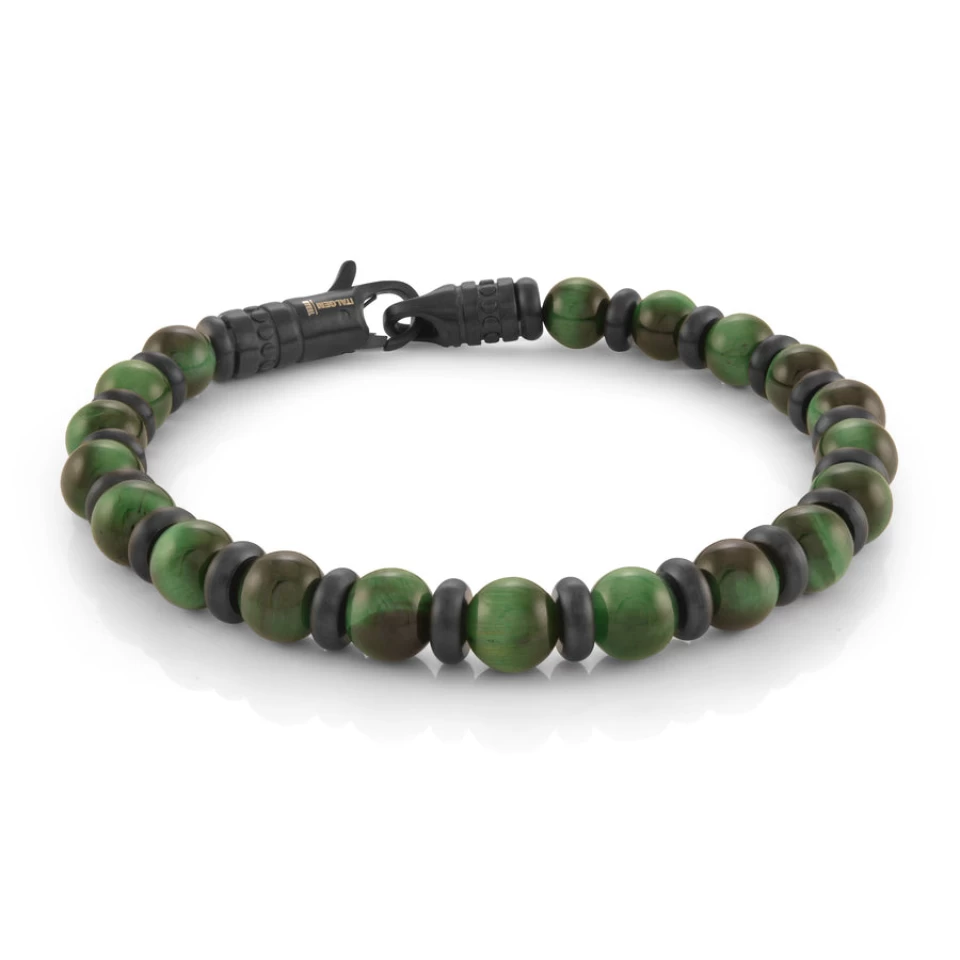 BRACELET OEIL DE TRIGRE VERT ET ÉLÉMENTS SS IONISÉ NOIR MAT