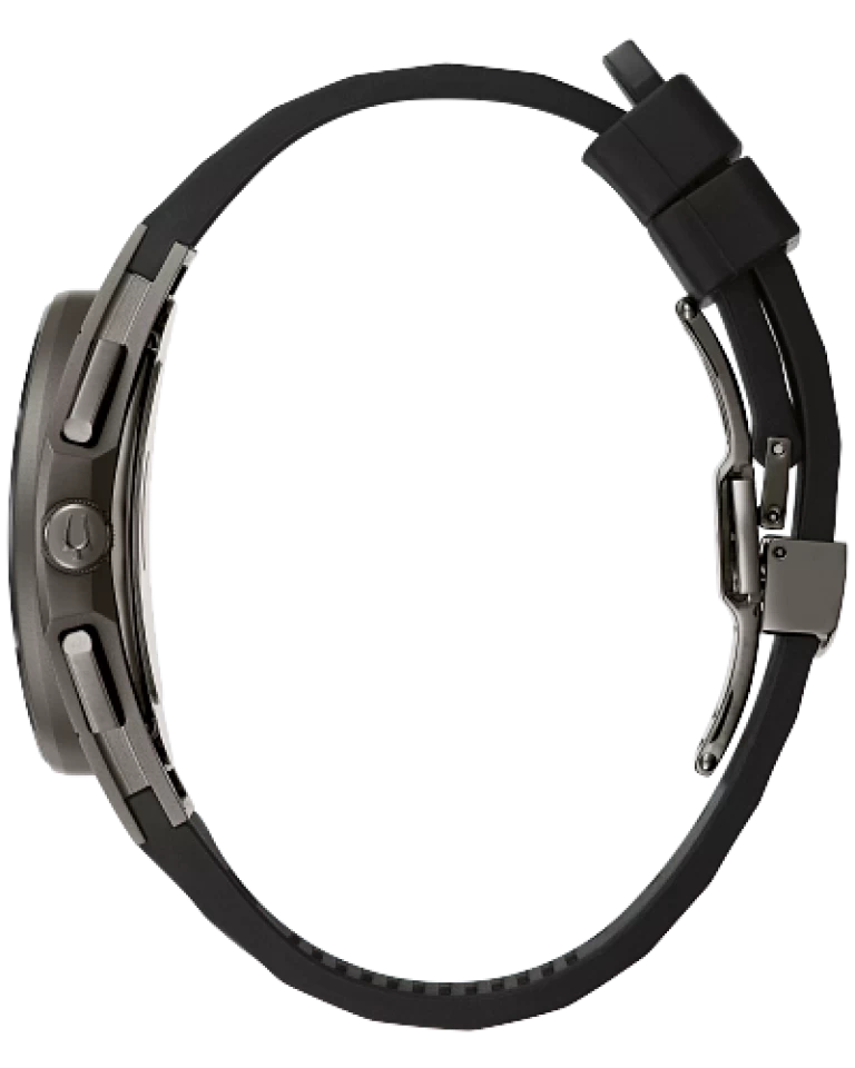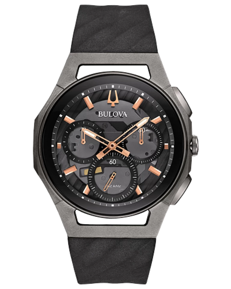 Issue de la nouvelle collection CURV. Le premier mouvement de chronographe incurvé au monde est doté d’une technologie à quartz de haute performance avec une fréquence de vibration de 262 kHz offrant une précision accrue. Chronographe à cinq aiguilles étanche jusqu’à 30 mètres, dans un boîtier en titane et acier inoxydable doté d’une lunette noire, d’un cadran transparent gris foncé aux accents de couleur or rose, d’un fond de boîtier vissé transparent, d’un verre en saphir incurvé, et d’une boucle ardillon en caoutchouc noir en trois pièces.