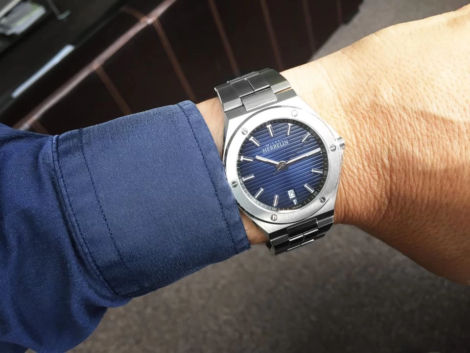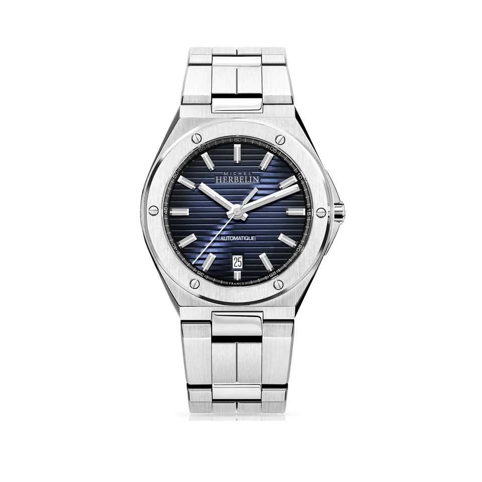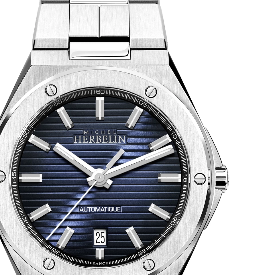 Cap Camarat est inspirée d’un lieu sauvage du sud de la France. Son design sculpté et racé assure un look sportif et élégant. Une boîte en acier inoxydable de 40.5 millimètres s’ouvre sur un cadran bleu à texture de lignes horizontales et nous offre une lecture claire des aiguilles et des index luminescents ainsi qu’un guichet de date à 6 heures. La lunette acier brossée bien définie par 6 accents de vis acier protège la glace saphir et complète harmonieusement le bracelet intégré à fermoir papillon.