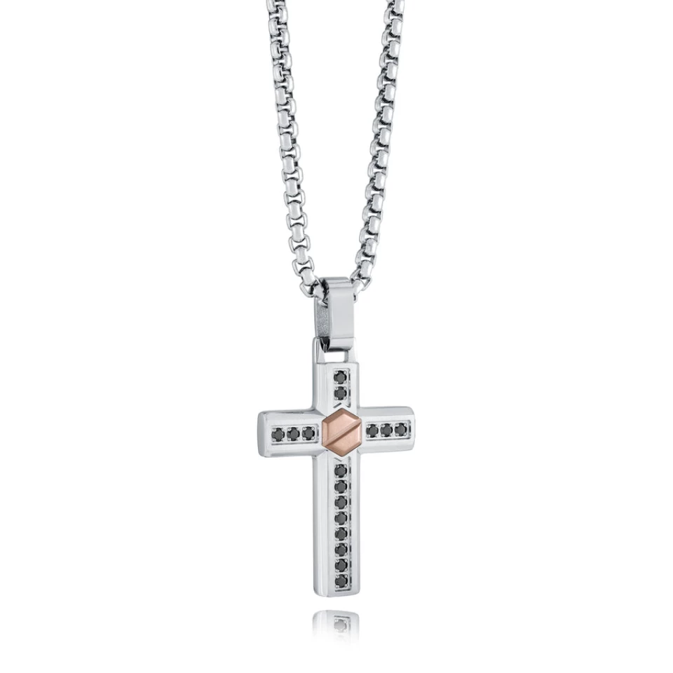 CHAINE ET ET PENDANT CROIX ACIER ET PLR CZ NOIR 22″