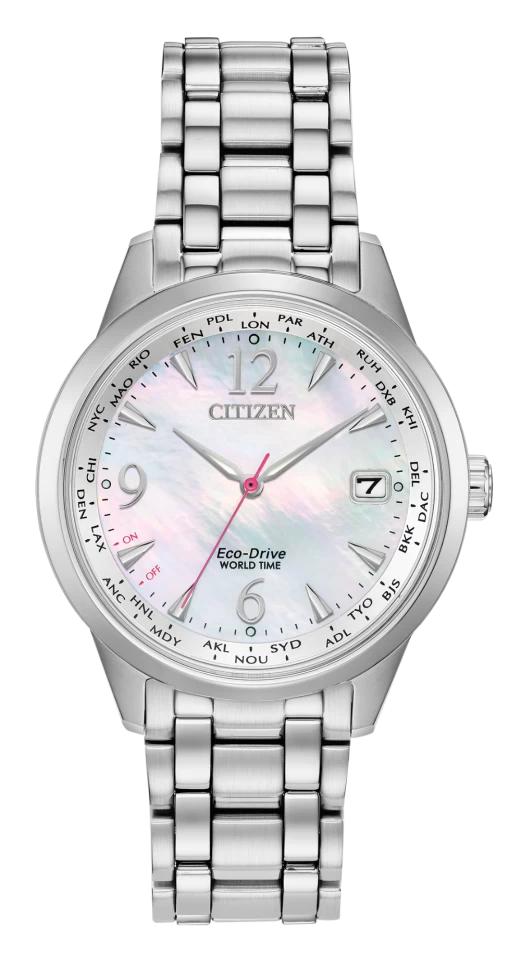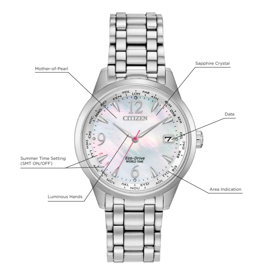 Faites un tour du côté technique avec la World Time Perpetual de CITIZEN®. Soyez toujours à l’heure et à la mode sans vous connecter avec les fonctions d’affichage de l’heure selon 26 fuseaux horaires, un calendrier perpétuel et un indicateur de date. Modèle montré en acier inoxydable avec cadran en nacre. Doté de la technologie Eco-Drive de CITIZEN® et alimenté par la lumière, sous toutes ses formes. N’a jamais besoin