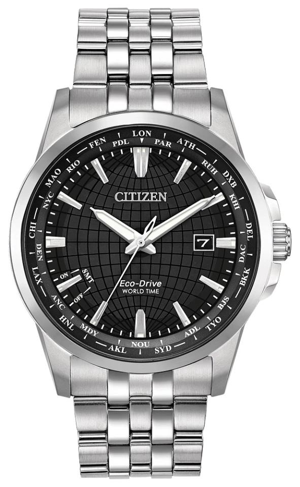 RedĂ©finissant une montre classique avec une touche de style, la Citizen World Time Perpetual Calendar apporte une nouvelle confiance. Un garde-temps qui n’est pas seulement une montre solaire, mais alimentĂ© par n’importe quelle lumière avec la technologie Eco-Drive, avec l’heure mondiale dans 26 fuseaux horaires, un calendrier perpĂ©tuel et une date. Vu ici dans un boĂ®tier et un bracelet en acier inoxydable avec cadran noir.