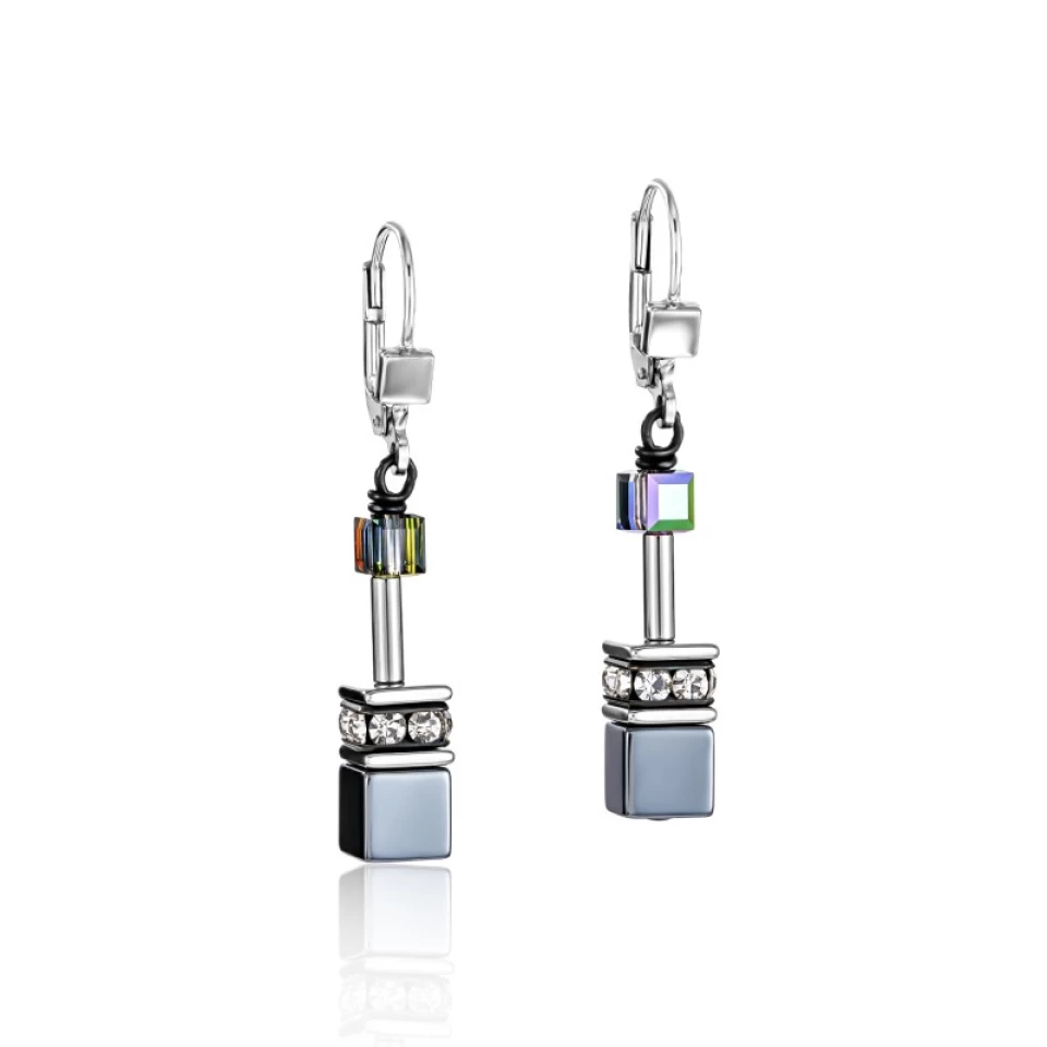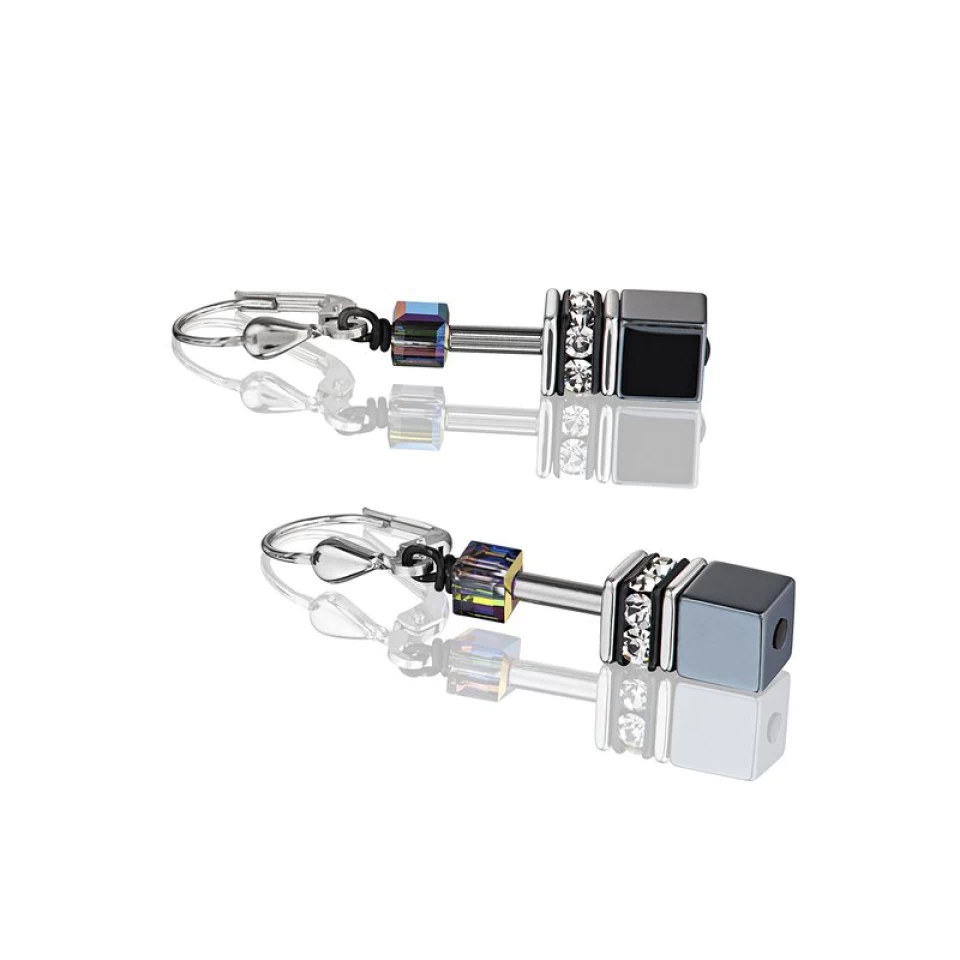 Boucles d’oreilles pendantes en acier inoxydable avec géocubes en crixtaux de Swarovski noirs et hématites grises.