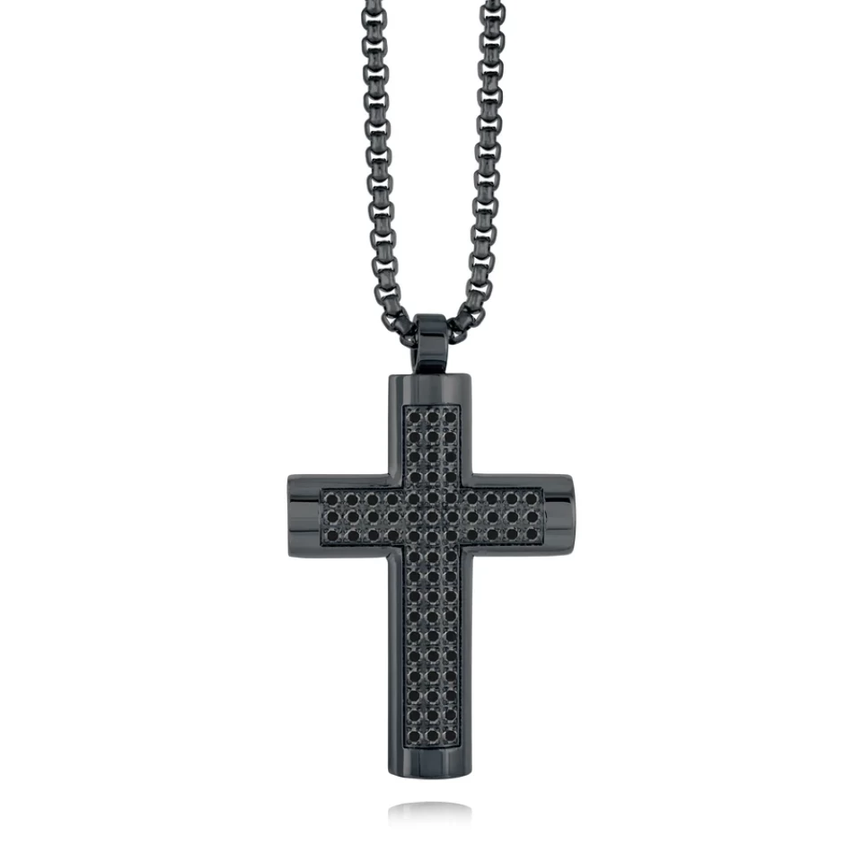COLLIER ET PENDENTIF CROIX ACIER INOXYDABLE GRIS CZ NOIR