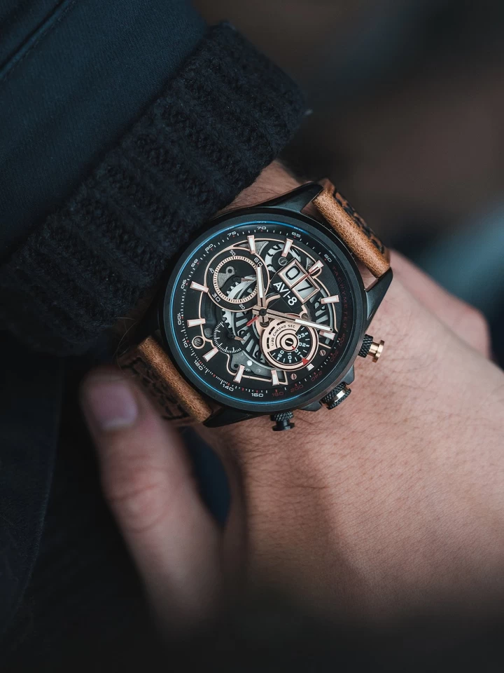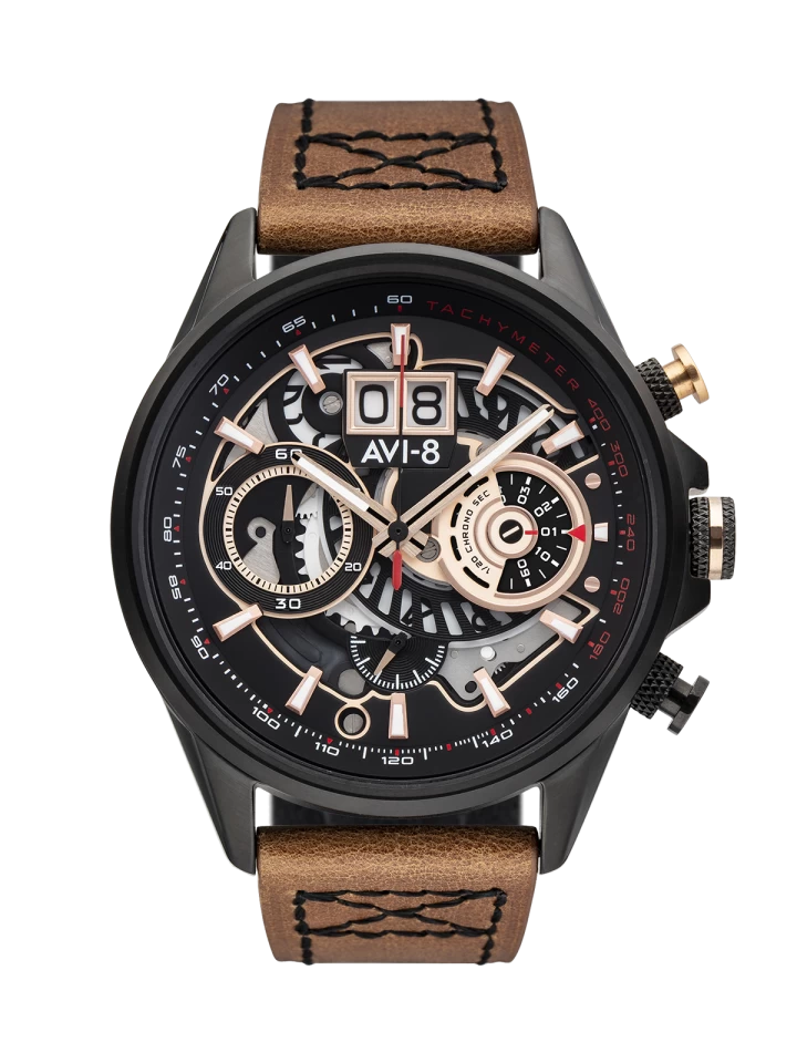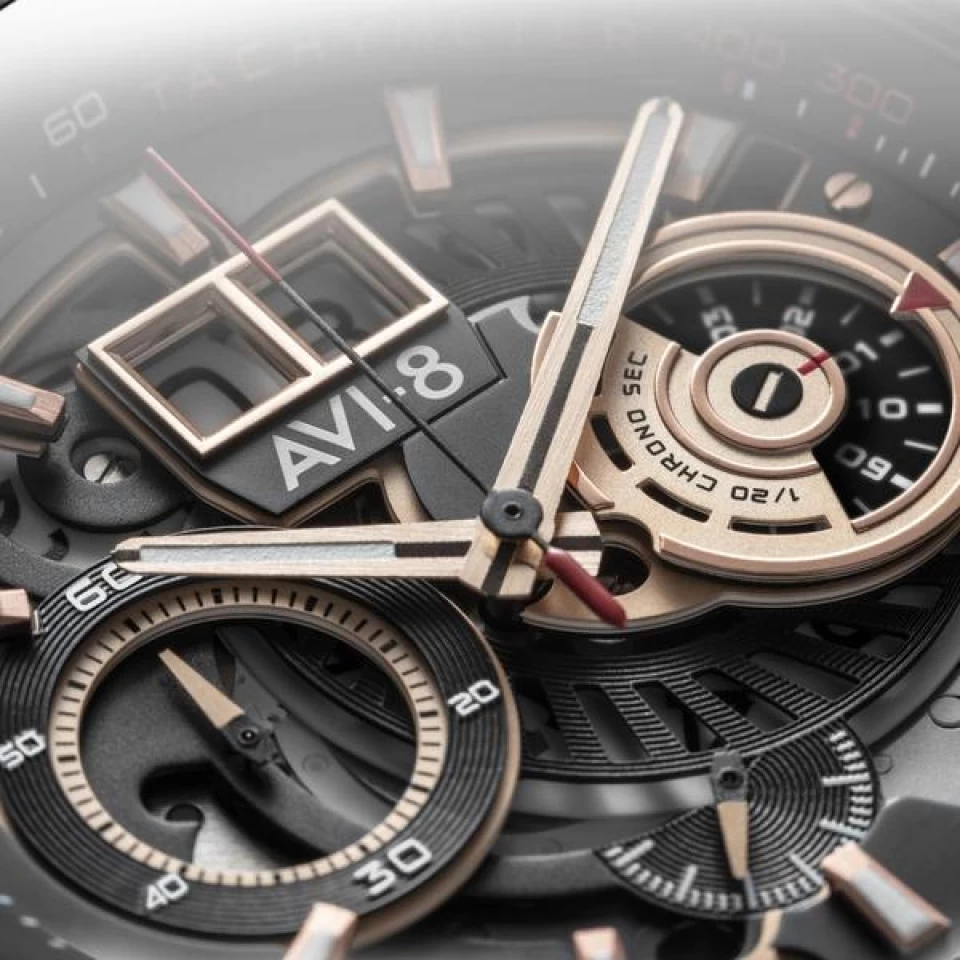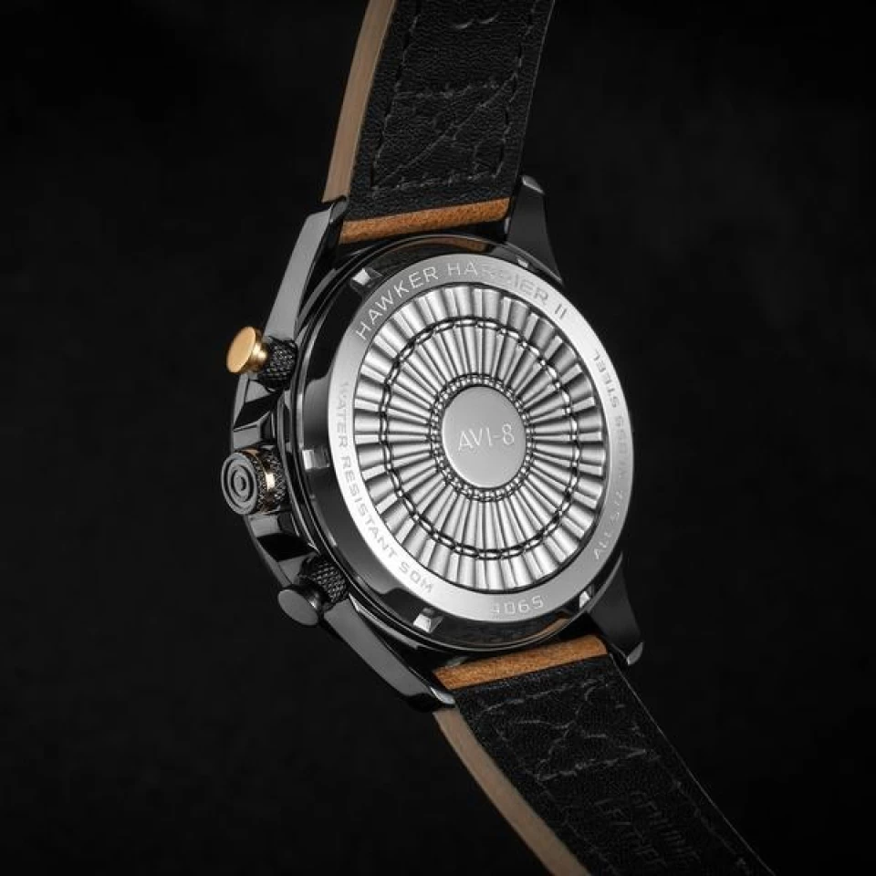 Le Hawker Harrier «Jump Jet» a trouvé du service dans plusieurs forces aériennes et navales au cours de la seconde moitié du 20e siècle. Il a représenté une percée dans la conception de l’aviation et a continué à servir de nombreuses missions avec distinction. Pour rendre hommage aux variantes de ce fameux jet, AVI-8 a présenté la dernière version de sa famille de chronographes Harrier inspirée des avions qui volaient pour la marine espagnole, surnommée le «Matador». En plein chronométrage, le Matador prend vie avec un vrombissement des mains et des roues qui créent une expérience dynamique qui n’est pas sans rappeler celle d’un Harrier en plein vol.