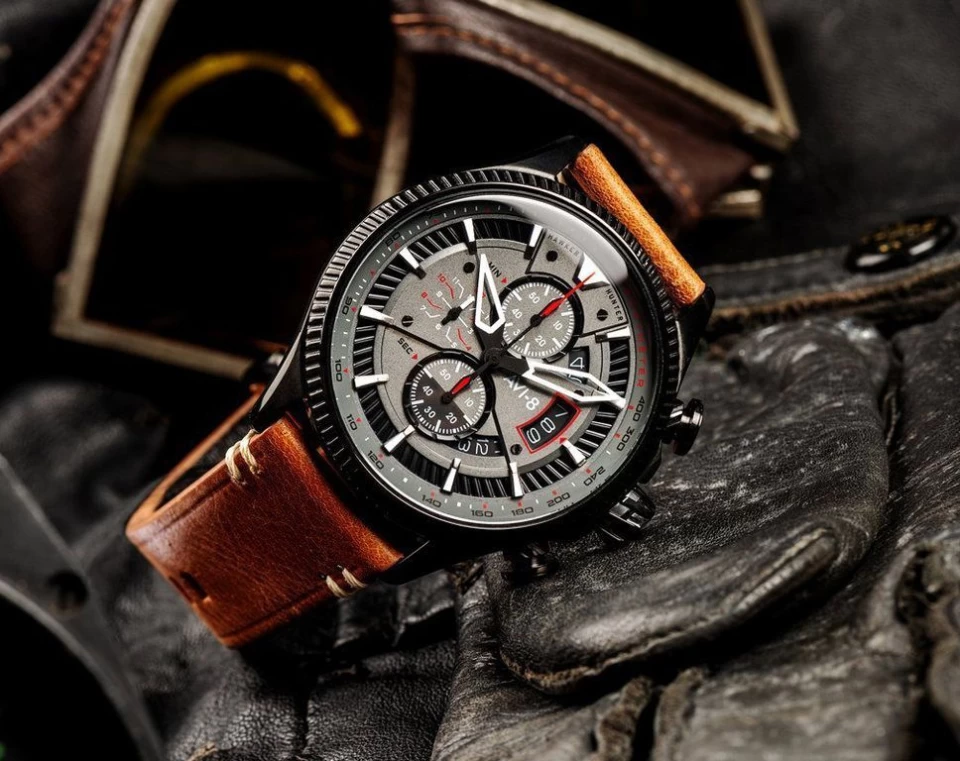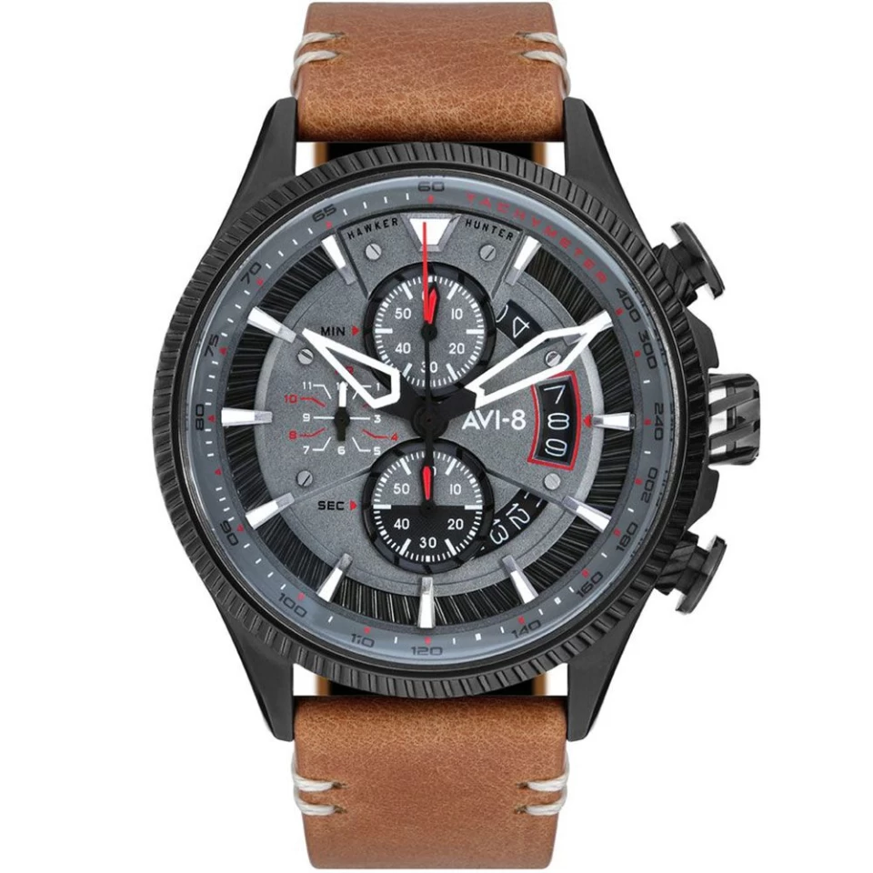 Nommé d’après le turboréacteur Avon propulsé par Rolls Royce, La AV-4064 est le dernier opus de montres inspirées de l’emblématique avion Hawker Hunter. Pour prononcer l’influence du moteur, la montre présente une lunette dentelée inclinée sur le boîtier de 45 mm. Le boîtier est doté d’un verre minéral durcie et fabriqué en acier inoxydable 316L. La couronne elle-même est une sorte de moteur qui fait écho aux indices esthétiques visibles sur la lunette et est associée à des pistons assortis comme des poussoirs de chronographe. Un cadran multicouche inspiré du cockpit regorge d’indices de conception et d’inspiration tirés directement du Hawker Hunter. Les aiguilles «fleiger» squelettées audacieuses sont modernes dans leur concept, mais familières, dans leur fonction et leur style. Les aiguilles tournent sur le cadran avec des marques de bâton lumineuses claires et un tachymètre lu sur l’anneau de tension intérieur. Attaché au poignet avec un bracelet en cuir cousu main d’inspiration vintage, il s’agit d’une pièce d’horlogerie portable, fonctionnelle et remarquablement détaillée.
