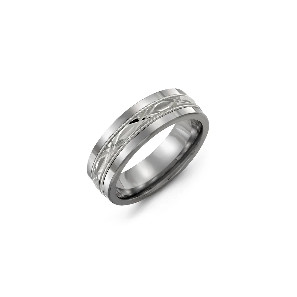 Cette élégante alliance gravée coupe diamant classique 7 mm pour homme est un bijou vraiment magnifique pour toute occasion spéciale. Fabriquée avec soin dans une base en tungstène, mais avec option en cobatt ou céramique noire, une insertion en or blanc 10k complète notre modèle en inventaire. Ce jonc classique pour homme est disponible en options 10kt, 14kt et 18kt, or jaune ou rose et dans des largeurs de 9 mm et 11 mm. Gravez l’intérieur avec un nom ou une date spéciale pour le rendre vraiment unique.