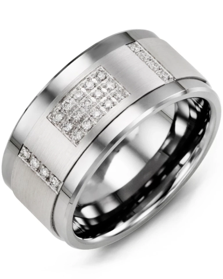 Un bijou éblouissant qui prouve que les diamants peuvent aussi être le meilleur ami d’un homme! Ce jonc en tungstène de qualité supérieure de 11 mm intégrant une insertion en or blanc au fini brossé est serti de 31 diamants divisés d’abord en 5 sections dans la partie centrale du jonc et intégrés dans 4 autres sections autour du corps de bague. L’insertion est disponible en or blanc, jaune ou rose et en options 10kt, 14kt ou 18kt. Plusieurs possibilités s’offrent à vous, sur commande.