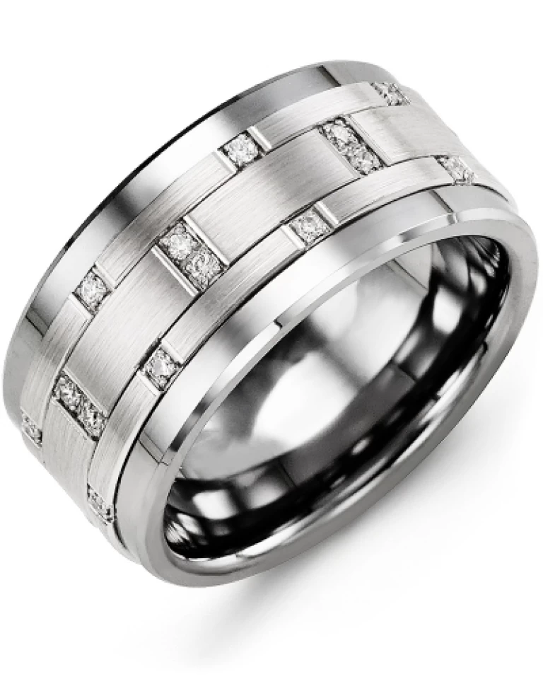 Ce jonc contemporain en tungstène de 11 mm et or blanc mat présente un superbe motif géométrique serti de 14 diamants. Des sections d’un et deux diamants sont judicieusement espacées autour dans les insertions en or, pour créer un éclat sous tous les angles. Vous pouvez également choisir parmi les options 10kt, 14kt ou 18kt. L’intérieur du jonc peut être gravé pour une alliance plus personnalisée. Plusieurs possibilités s’offrent à vous, sur commande.
