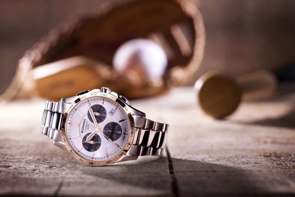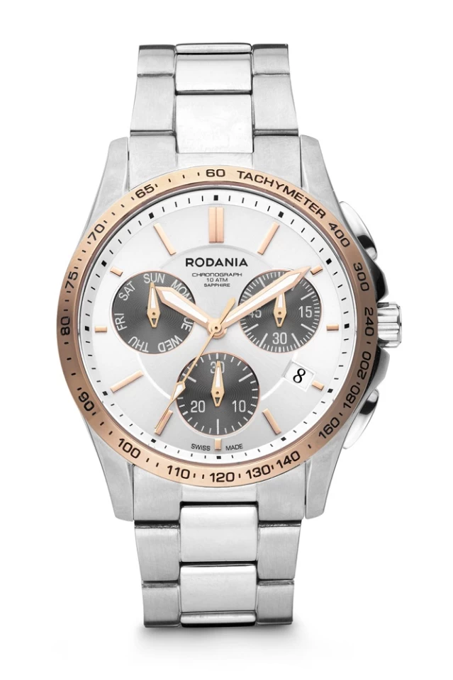 Ce chronographe de trente minutes avec trotteuse centrale, fonctions split et rattrapante dans une boîte acier de 41 millimètres à lunette tachymètre plaquée or rose est surmonté d’un verre saphir. Le cadran blanc nous offre 3 sous-cadrans gris foncés pour jour, trotteuse et minute de chrono ainsi qu’un guichet de date à 4 heures. Un sobre bracelet acier à boucle déployante complète cette montre étanche à 100 mètres.