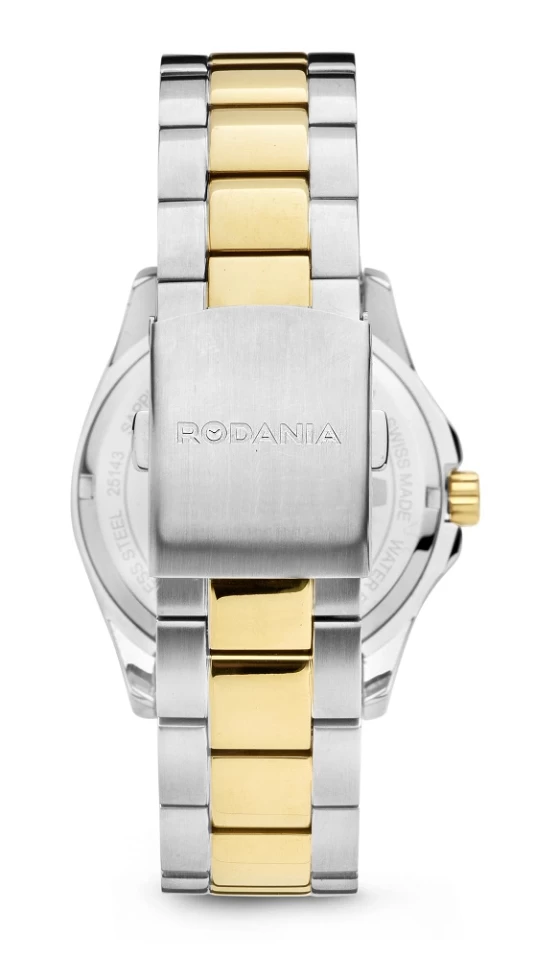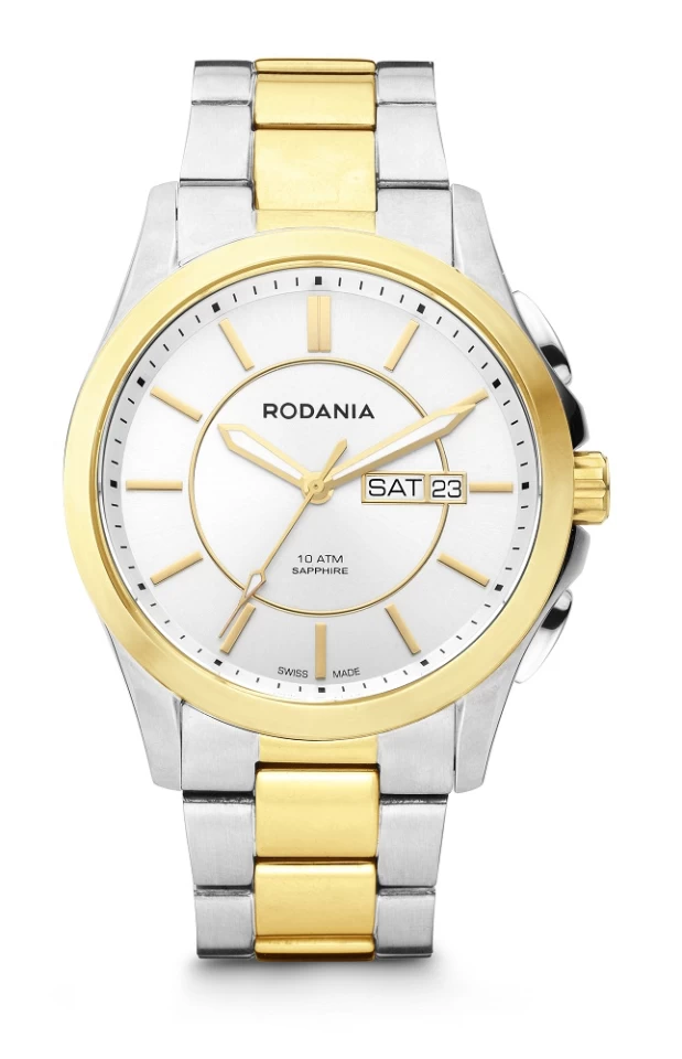 Cette montre de ville étanche à 100 mètres de 41 millimètres en acier deux tons plaqué or jaune PVD a un verre saphir et un bracelet agencé à boucle déployante. Le cadran argenté offre un guichet double de jour et date et des index dorés. Des aiguilles luminescente permettre une lecture des plus claire.