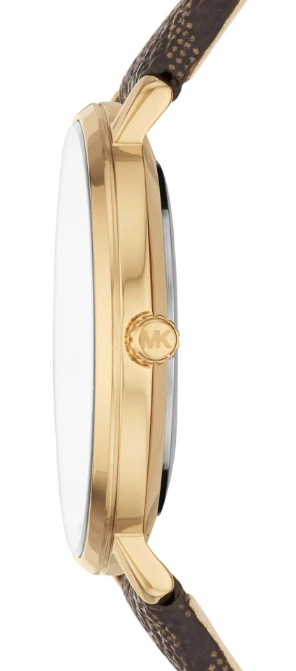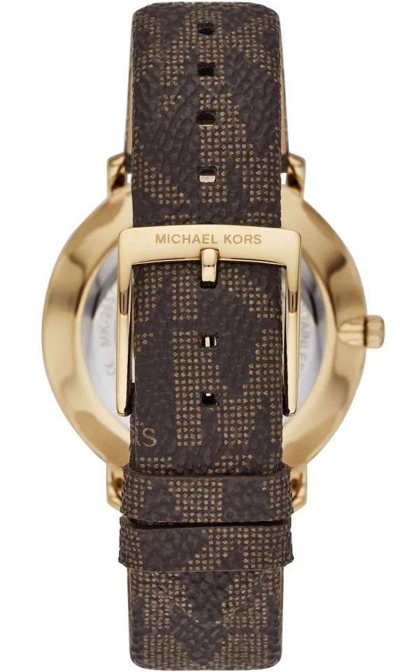 Cette Michael Kors MK2857 est une jolie montre pour femme. Le boîtier de 38mm est en acier inoxydable plaqué or jaune et possède un cadran blanc et un bracelet en cuir nubuck brun à motifs.