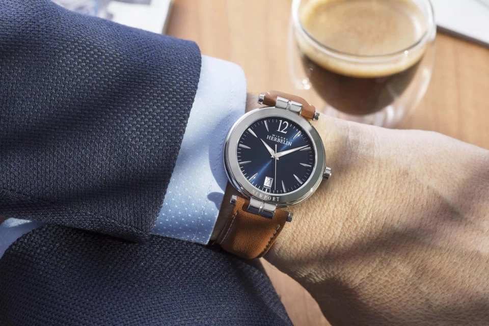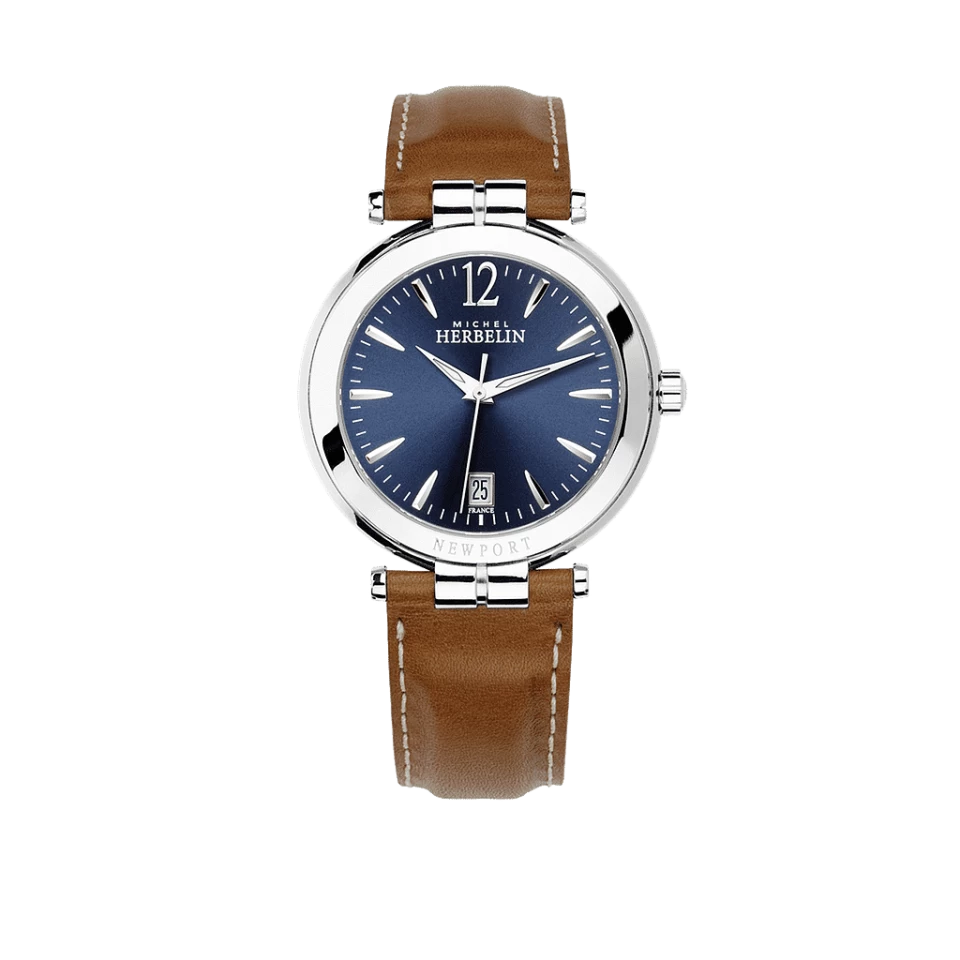 Inspirée par les hublots de navires transatlantiques et dotée d’une forte personnalité, Newport est le modèle emblématique de la Maison Michel Herbelin. Alliance parfaite entre son cadran bleu et son bracelet en cuir gold, cette montre Michel Herbelin reflète classicisme et raffinement. Marqué par des index argent et un guichet date à 6h elle épouse les poignets masculins avec inspiration et élégance.