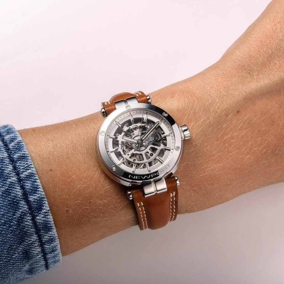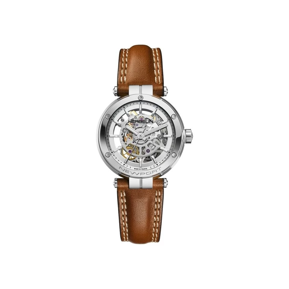 La squelette de Newport se distingue par sa beauté à l’intérieur. Combinant des détails complexes avec des caractéristiques essentielles, cette montre révèle son fonctionnement interne à travers ses deux verres saphir. Attrapant la lumière au moindre mouvement de son corps en acier poli et facetté, le squelette Newport affiche son mouvement à remontage automatique via un cadran transparent. Ce garde-temps élégant et sportif est étanche à 100 mètres et s’inspire des tons bruts et industriels du mécanisme décoré à la main. Conçue, assemblée, ajustée et inspectée au studio Herbelin, cette série offre l’assurance de normes techniques rigoureuses. Son boitier épuré de 35 millimètres est muni d’un cuir brun articulé d’une boucle papillon.