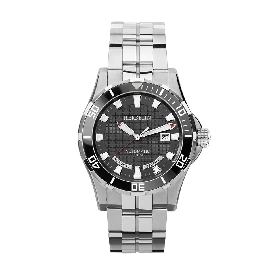 Cette Newport Grand Trophy de 43 millimètres fait partie de la série la plus robuste de Michel Herbelin. Habillée d’une lunette de plongée rotative unidirectionnelle en céramique à insertion numérique super luminescents, cette montre à remontoir automatique est étanche à 200 mètres. Son verre saphir nous livre un cadran à texture quadrillé, des index et aiguilles luminescents grands formats et un guichet de date à 3 heures.Son bracelet à boucle déployante a une extension de plongée. Le dos vissé à verre saphir offre une vue complète du mouvement.
