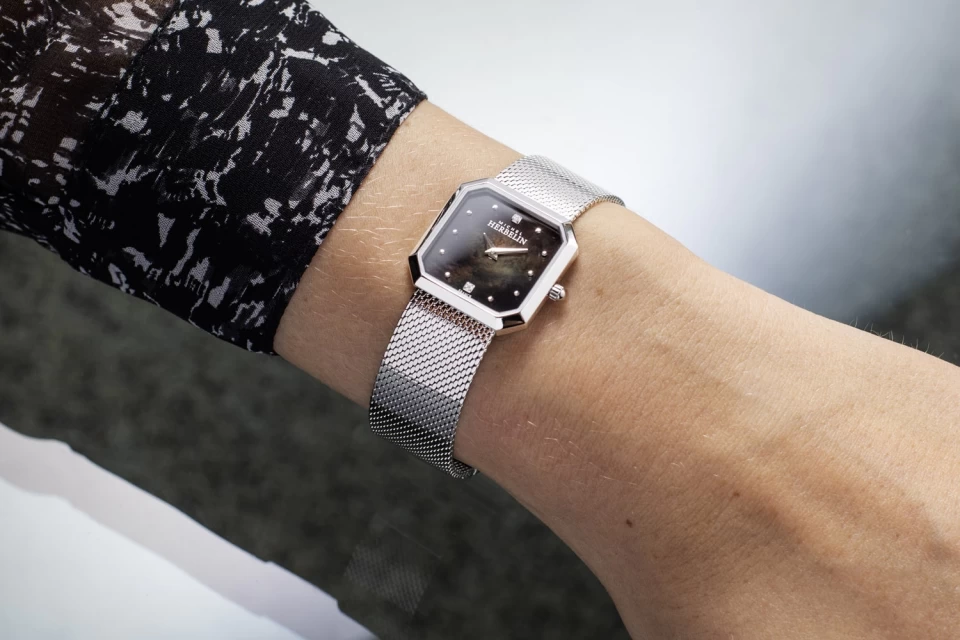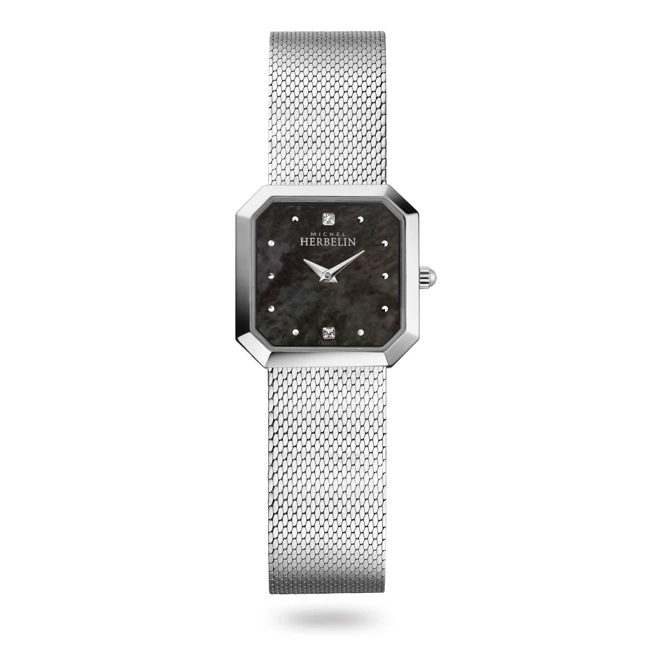 L’Atelier d’Horlogerie française Michel Herbelin présente une nouvelle collection baptisée Octogône. Identifiable au premier coup d’œil par son esthétique minimaliste, ce premier modèle dévoile un concentré d’élégance. Délicieusement précieux. Assurément moderne. Définie par une géométrie tout en délicatesse la collection Octogône présente des montres graphiques, féminines et raffinées. Une boite acier et un verre saphir nous offre un cadran nacré noir épuré avec de petits index et deux CZ à six et douzes heures. Un bracelet intégré à mèche aciier se marie parfaitement à la géométrie de la boîite.