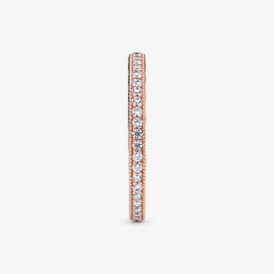 Allez au bout de vos désirs grâce à cette bague gage d’amour éternel étincelante. Finie à la main en Pandora rose, un alliage exclusif plaqué d’or rose 14 carats, cette bague au design élégant associe avec brio d’étincelantes pierres en zircon cubique et des cœurs délicatement taillés. Arborez-la seule ou réalisez un élégant jeu de textures en l’associant à d’autres bagues superposables Pandora.
