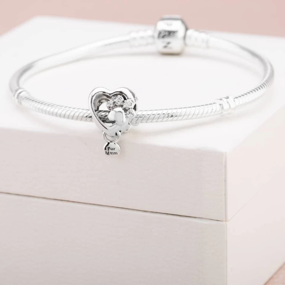 Cette breloque à imprimé patte scintillante et cœur fini à la main ajoute une touche douce à n’importe quelle tenue. Fabriquée en argent sterling, la breloque en forme de cœur comporte une patte de chien au centre et est remplie de détails en zircone cubique transparente pour une touche supplémentaire d’éclat. Une petite étiquette pendante avec la gravure «Fur mum» montre que les animaux de compagnie sont importants pour nous et font partie de notre famille et de notre vie.