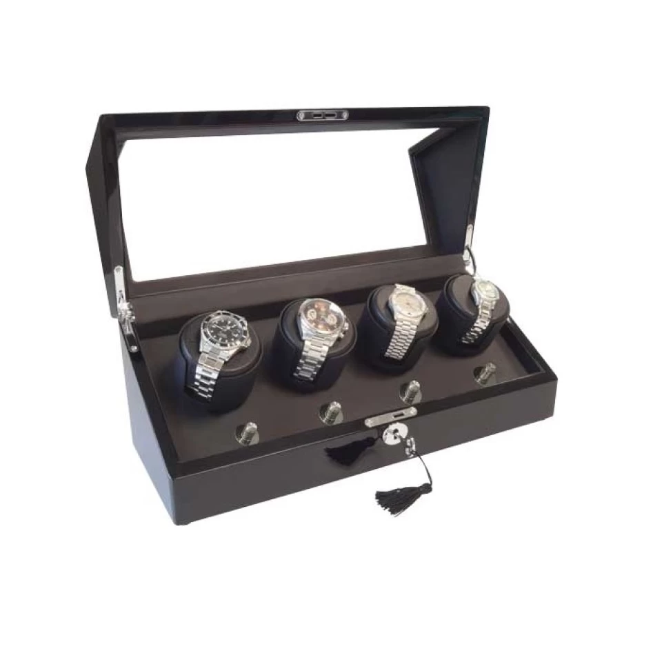 Conservez jusqu’Ă quatre de vos montres automatiques Ă©lĂ©gamment protĂ©gĂ©s et remontĂ©s pour une utilisation Ă tout moment. L’extĂ©rieur noir brillant est associĂ© Ă une doublure intĂ©rieure en similicuir noir souple. Les grands coussins de montre s’adapteront aux cadrans et aux bracelets de montre surdimensionnĂ©s. Deux moteurs japonais garantiront que vos plus belles montres sont prĂŞtes Ă porter. Les charnières de style boussole chromĂ©es et la serrure et la clĂ© de travail accentuent la construction de qualitĂ©.