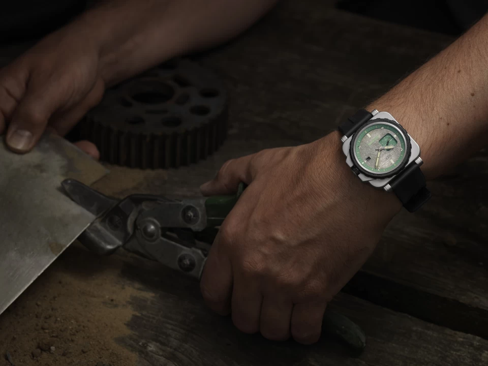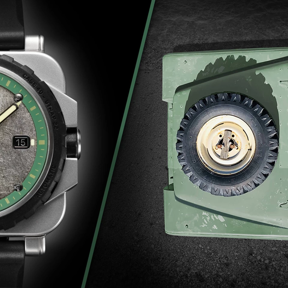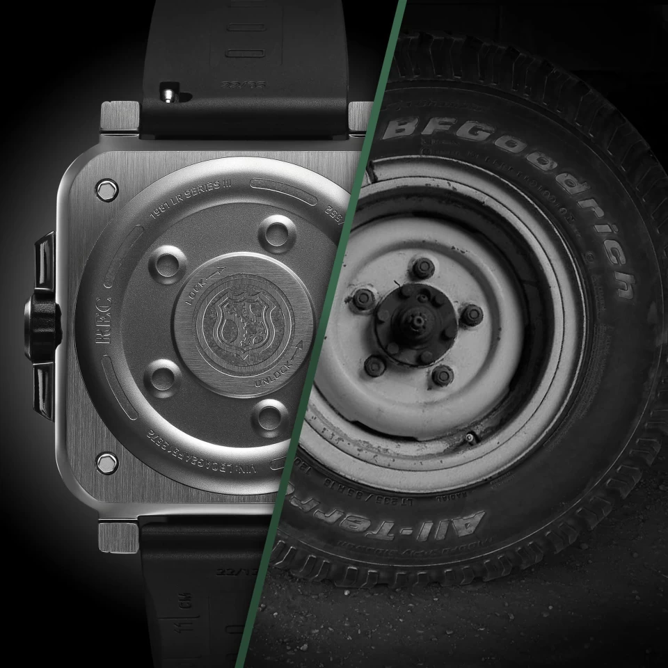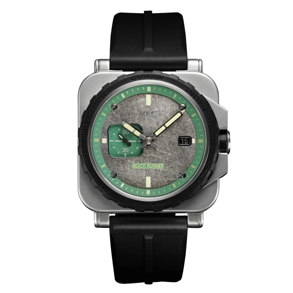 La RNR Beachrunner est notre toute première montre de fabrication suisse avec un cadran fabriqué à la main à partir du toit d’un Land Rover de 1981. Limité à 552 pièces.