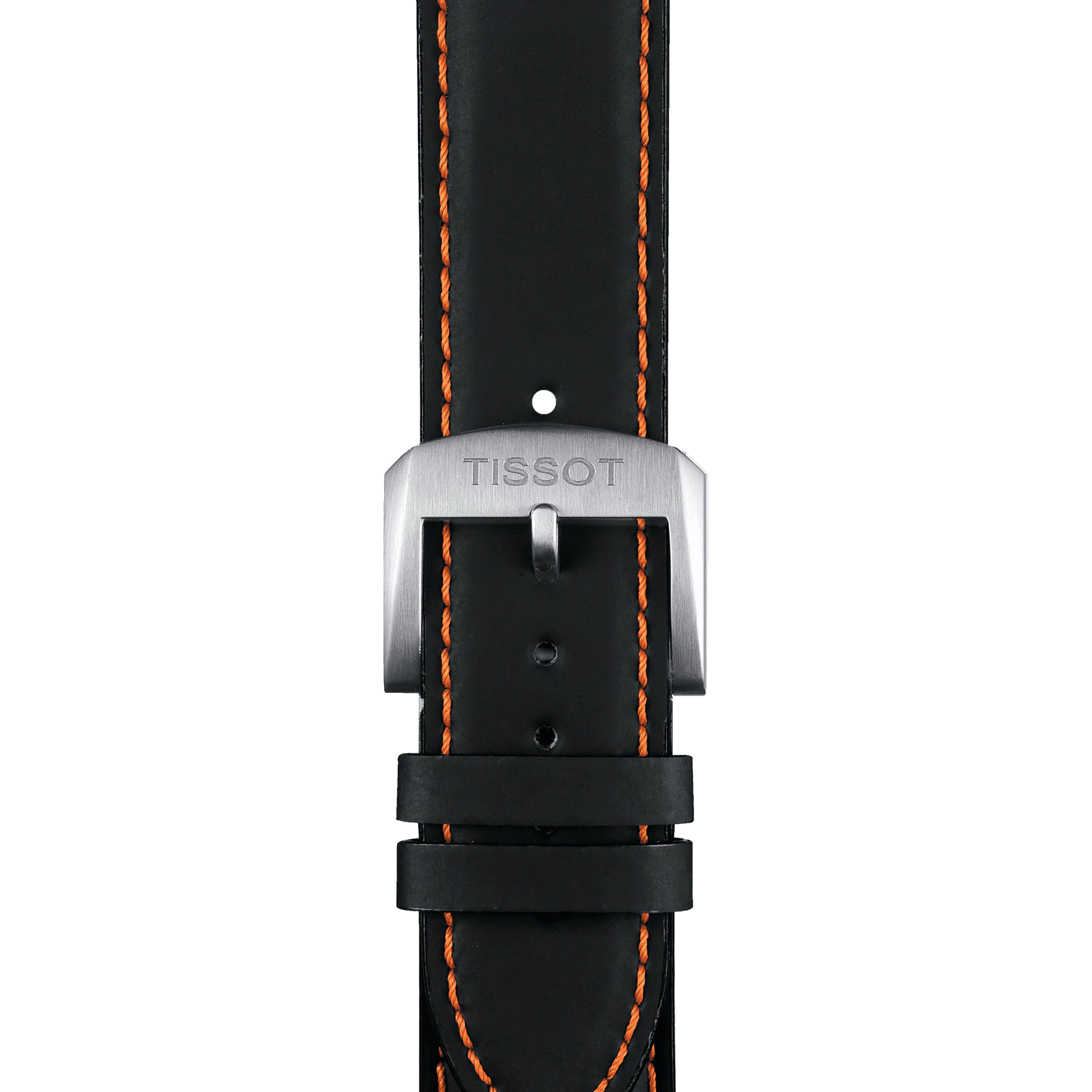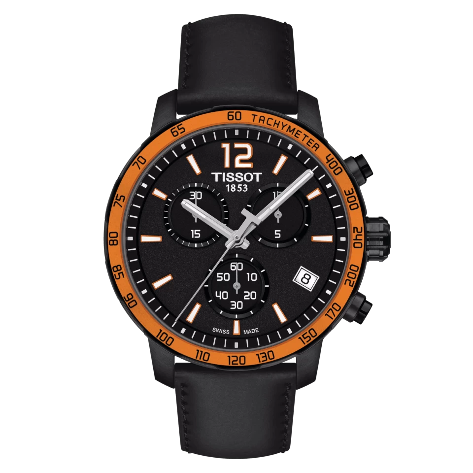 La Tissot Quickster est une montre sportive destinée aux personnes jeunes et dynamiques à la recherche d’une certaine classe. Sa boîte de 42 millimètres en acier inoxydable est motorisée par un chronographe de 30 minutes, une trotteuse centrale et un sous-cadran au dixième de seconde. Le design de la lunette orange brulé, très fin, offre un tachymètre délicat et une plus grande ouverture sur le cadran, tandis que le pourtour en aluminium apporte de la couleur à la montre et lui confère un nouveau look. Sous la glace saphir, le cadran noir aux sous cadrans tons sur tons, un marqueur durdimensionné des 12 heures à chiffre arabes, des index et aiguilles luminescents a un guichet de date à 4 heures.