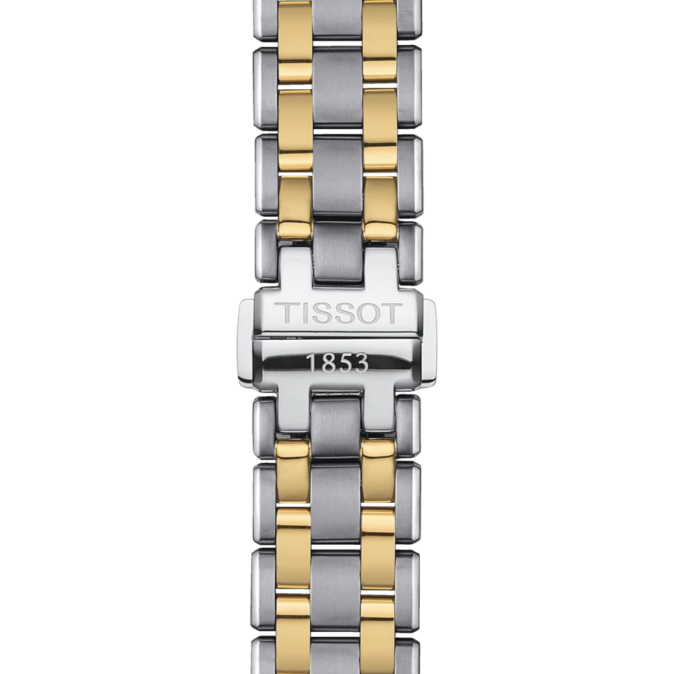 De la série T-Lady cette pièce aux détails raffinés a un boitier de 34 millimètres et un bracelet à boucle papillon en acier satiné et plaqué or jaune PVD. Entourant son verre saphir, la lunette fixe et la couronne, toutes deux découpées de subtils encoches, font rappel aux index plaqués or jaune PVD et au marqueur de douze heures en chiffres romains. Le cadran argenté deux tons nous offre de magnifiques aiguilles ouvertes dorées tout comme le cadre du guichet de date à 3 heures.